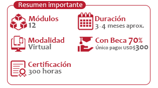 La metodología es un proceso de enseñanza-aprendizaje significativo a través de nuestro Campus Virtual. Este entorno virtual permite el desarrollo de programas de formación y capacitación virtual en un ambiente autónomo, flexible, intuitivo, amigable y adaptable a distintos dispositivos: ordenadores de escritorio, tablets y móviles para su correcta visualización (Resposive design); disponible las 24 horas del día con conexión a internet sin límites de tiempo, espacio, lugar (Ubicuidad); posibilidad de descargar los materiales con la finalidad de disponer de éstos fuera de línea. Este modelo y característica de la plataforma permite a los participantes la transmisión de conocimientos y compartir experiencias con el resto de la comunidad virtual a través de las distintas herramientas de comunicación, contenidos, evaluaciones, autoevaluaciones, foros, casos de estudios, etc., acompañamiento y retroalimentación del tutor que faciliten el proceso de enseñanza-aprendizaje con la finalidad que el participante adquiera las competencias y habilidades necesarias para cumplir los objetivos del programa.