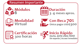 La metodología es un proceso de enseñanza-aprendizaje significativo a través de nuestro Campus Virtual. Este entorno virtual permite el desarrollo de programas de formación y capacitación virtual en un ambiente autónomo, flexible, intuitivo, amigable y adaptable a distintos dispositivos: ordenadores de escritorio, tablets y móviles para su correcta visualización (Resposive design); disponible las 24 horas del día con conexión a internet sin límites de tiempo, espacio, lugar (Ubicuidad); posibilidad de descargar los materiales con la finalidad de disponer de éstos fuera de línea. Este modelo y característica de la plataforma permite a los participantes la transmisión de conocimientos y compartir experiencias con el resto de la comunidad virtual a través de las distintas herramientas de comunicación, contenidos, evaluaciones, autoevaluaciones, foros, casos de estudios, etc., acompañamiento y retroalimentación del tutor que faciliten el proceso de enseñanza-aprendizaje con la finalidad que el participante adquiera las competencias y habilidades necesarias para cumplir los objetivos del programa.